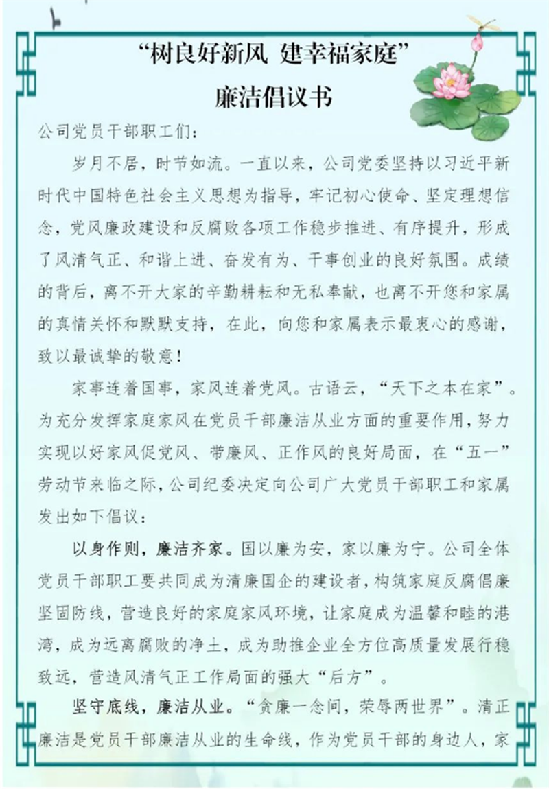 集團公司把家風建設作為廉潔文化建設的重要一環,結合文明家庭創建,開展家庭助廉教育,以家風促作風,以親情促廉情。