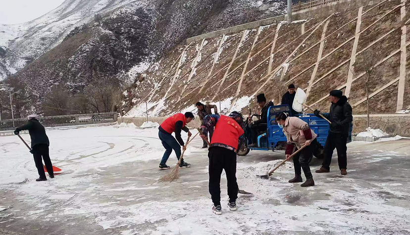 2月7日,農歷大年初七,伴隨著凜冽的寒風,卓尼縣柳林鎮東石溝村氣溫驟降,雪花紛紛揚揚地飄落,厚厚地積雪給人民群眾的生活帶來諸多不便。甘肅工程咨詢集團駐村幫扶工作隊在鎮黨委的統一部署下,不畏嚴寒,迅速投入到環境衛生整治、融化結冰路面和清掃積雪活動中。