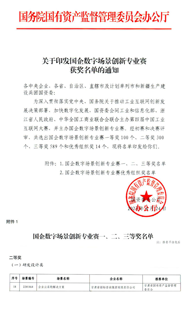 近日,國(guó)務(wù)院國(guó)資委公布了首屆“國(guó)企數(shù)字場(chǎng)景創(chuàng)新專業(yè)賽”獲獎(jiǎng)名單。甘肅工程咨詢集團(tuán)組織推薦的“甘招企業(yè)云采購平臺(tái)”創(chuàng)新場(chǎng)景,在全國(guó)2007家參賽企業(yè)推薦的3277個(gè)場(chǎng)景中脫穎而出,榮獲二等獎(jiǎng)!