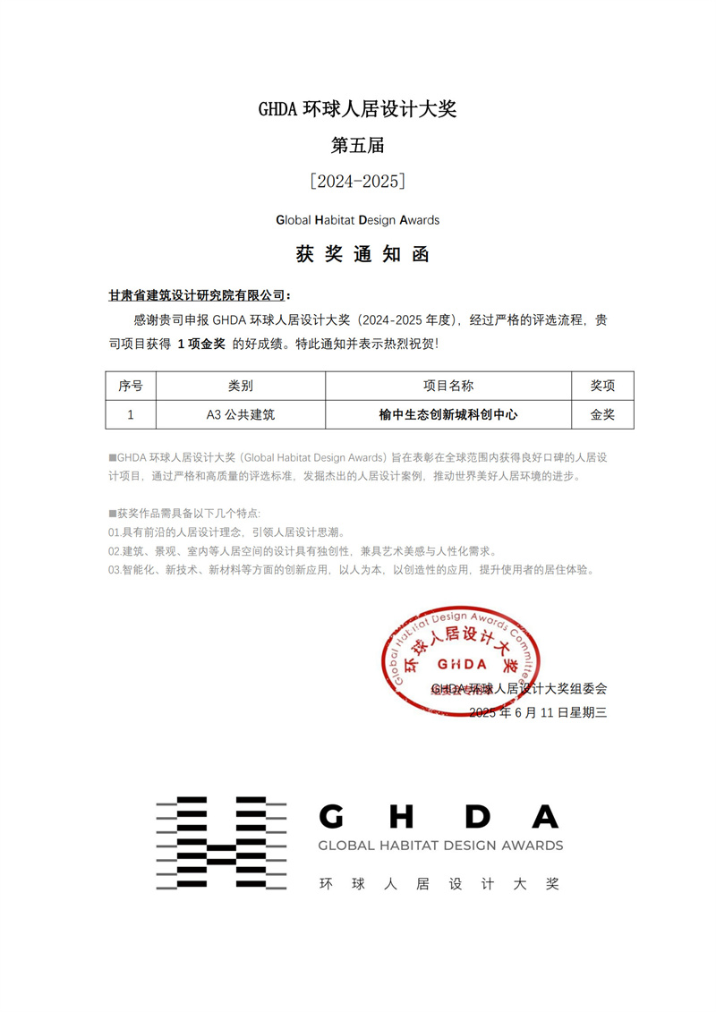 近日,備受矚目的第五屆GHDA環(huán)球人居設(shè)計大獎獲獎名單揭曉。甘肅工程咨詢集團(tuán)旗下省建筑設(shè)計院精心打造的榆中生態(tài)創(chuàng)新城科創(chuàng)中心項(xiàng)目,繼榮獲美國綠色建筑委員會頒發(fā)的LEED V4 BD+C鉑金級預(yù)認(rèn)證、中國綠色建筑三星級預(yù)評價兩項(xiàng)權(quán)威認(rèn)證后,再度摘得公共建筑類金獎,彰顯出我省在人居設(shè)計領(lǐng)域的卓越實(shí)力。