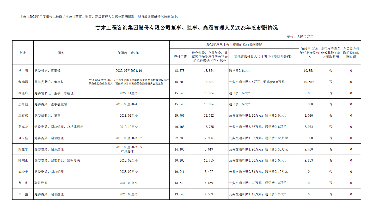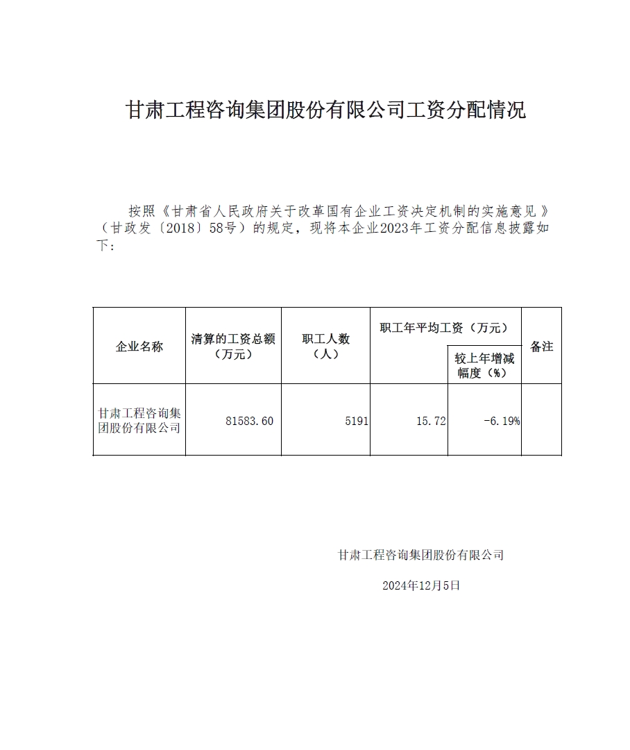 甘肅工程咨詢集團(tuán)股份有限公司董事、監(jiān)事、高級(jí)管理人員2023年度薪酬情況及甘肅工程咨詢集團(tuán)股份有限公司工資分配情況