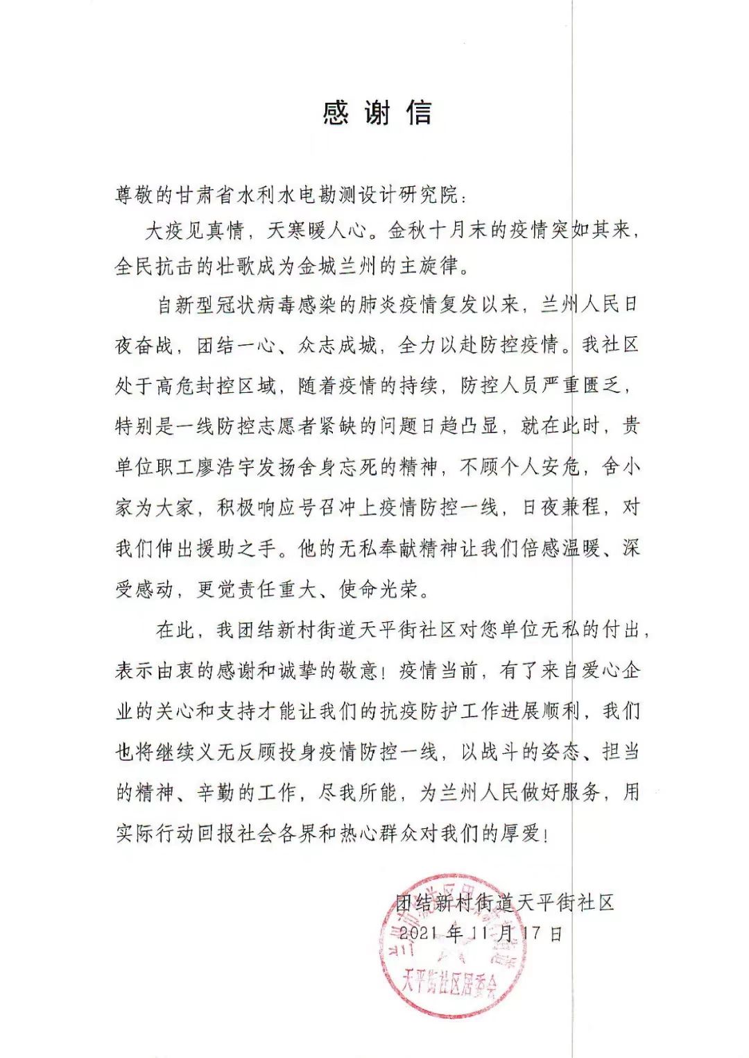 近日,水電設(shè)計(jì)院收到中志協(xié)蘭州服務(wù)隊(duì)和團(tuán)結(jié)新村街道天平街社區(qū)發(fā)來(lái)的感謝信。信中對(duì)水電設(shè)計(jì)院規(guī)劃院?jiǎn)T工廖浩宇在此次疫情發(fā)生后,主動(dòng)請(qǐng)纓參加疫情防控服務(wù)工作,甘當(dāng)疫情防控最美逆行者,持續(xù)堅(jiān)持26天志愿者服務(wù)的先進(jìn)事跡表示感謝。