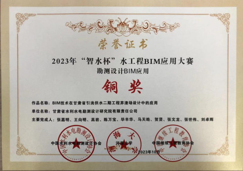 近日,中國水利水電勘測設(shè)計(jì)協(xié)會(huì)發(fā)布了2023年“智水杯”水工程BIM應(yīng)用大賽獲獎(jiǎng)項(xiàng)目,省水電設(shè)計(jì)院申報(bào)的《BIM技術(shù)在甘肅省引洮供水二期工程棄渣場設(shè)計(jì)中的應(yīng)用》獲得勘測設(shè)計(jì)MIM應(yīng)用銅獎(jiǎng)。