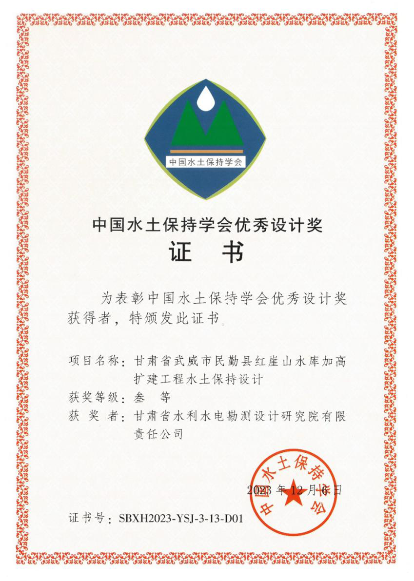 近日,第四屆中國(guó)水土保持學(xué)術(shù)大會(huì)在福建福州舉行。省水電設(shè)計(jì)院勘測(cè)設(shè)計(jì)的《武威市民勤縣紅崖山水庫(kù)加高擴(kuò)建工程水土保持設(shè)計(jì)》《黃河干流甘肅段防洪治理工程水土保持設(shè)計(jì)》兩項(xiàng)水土保持設(shè)計(jì)成果榮獲第四屆中國(guó)水土保持學(xué)會(huì)優(yōu)秀設(shè)計(jì)三等獎(jiǎng)。
