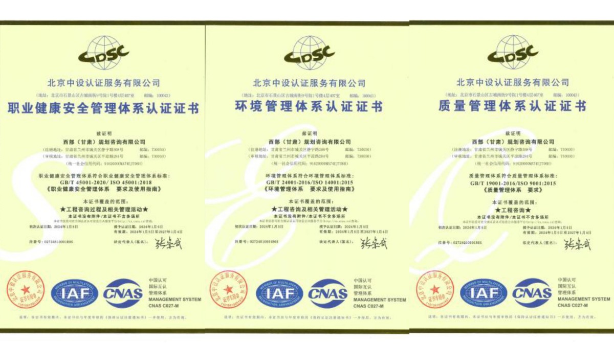 近日,經(jīng)北京中設(shè)認(rèn)證服務(wù)有限公司評(píng)審,西部(甘肅)規(guī)劃咨詢有限公司順利通過(guò)ISO9001質(zhì)量管理體系、ISO14001環(huán)境管理體系、ISO45001職業(yè)健康安全管理體系認(rèn)證并取得證書(shū)。