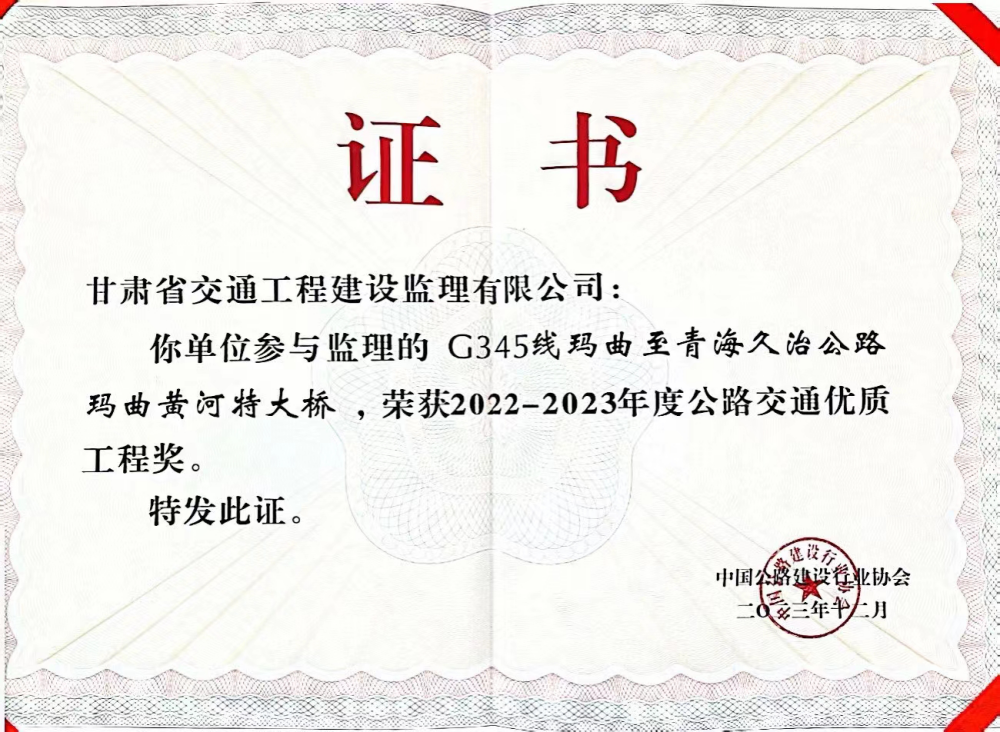 近日,中國公路建設行業協會于湖北武漢召開第五屆公路建設高質量大會暨2022-2023年度公路交通優質工程獎表彰大會。省交通監理公司“代建+監理”的G345線瑪曲至青海久治公路瑪曲黃河特大橋榮獲公路交通優質工程獎。此次獲獎系公司在兩徽、金阿高速公路之后第三次獲得全國公路交通優質工程獎——李春獎。