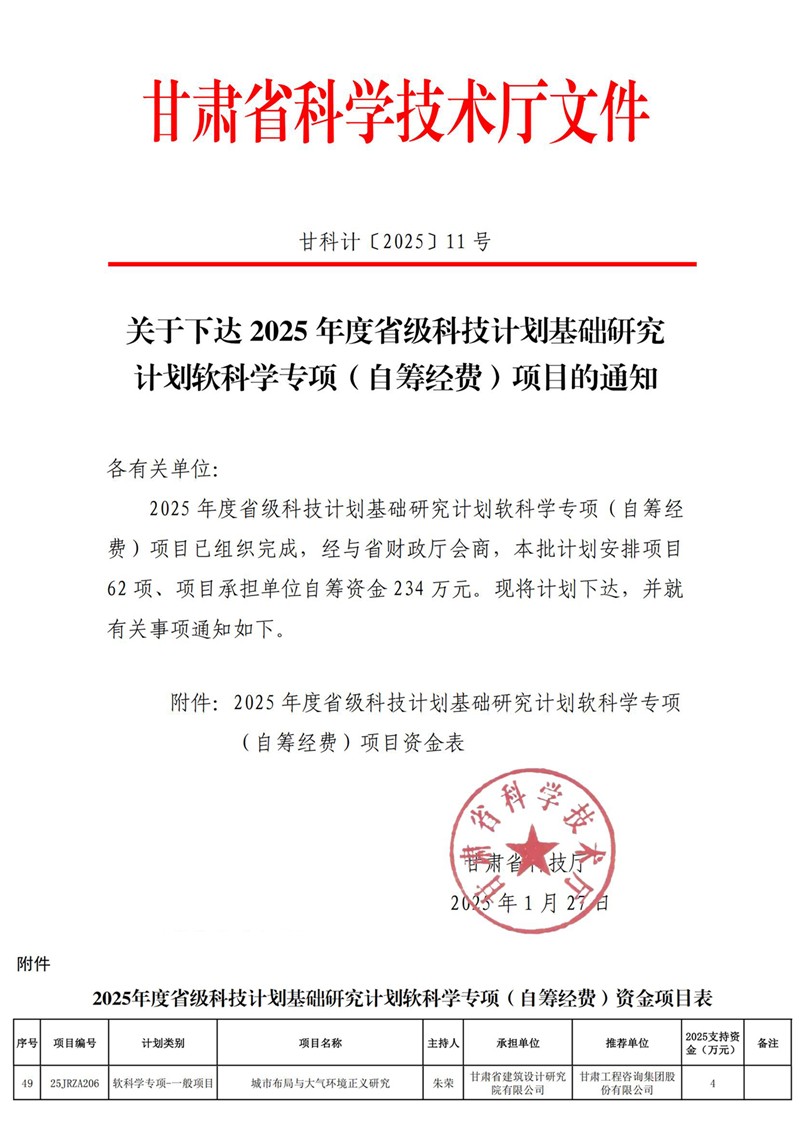 近日,甘肅省科技廳公布了2025年省級科技計劃基礎研究計劃軟科學專項(自籌經費)項目立項結果,省建筑設計院申報的“城市布局與大氣環境正義研究”項目獲批立項。